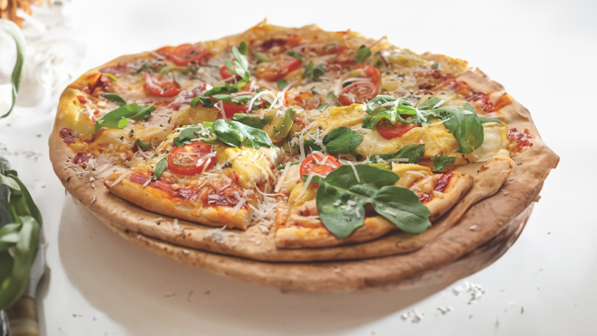 - Bake at 200°C for 10 minutes. Remove from oven and sprinkle rocket leaves, Spur Seasoning Salt and pepper over to serve.